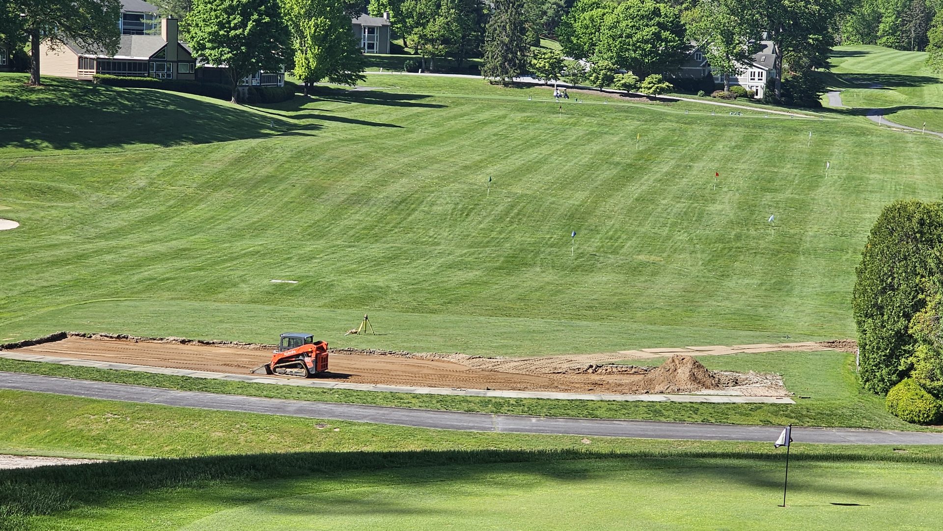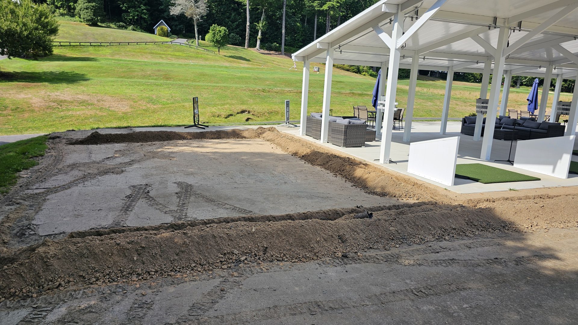 By early May, laser-guided grading was underway to shape the tee line pad. The base layer of gravel was compacted to exact specifications, creating a stable foundation for the concrete slab that would become the hitting platform. The range targets remained visible in the distance - a reminder of how the new technology would soon enhance a familiar practice setting.
