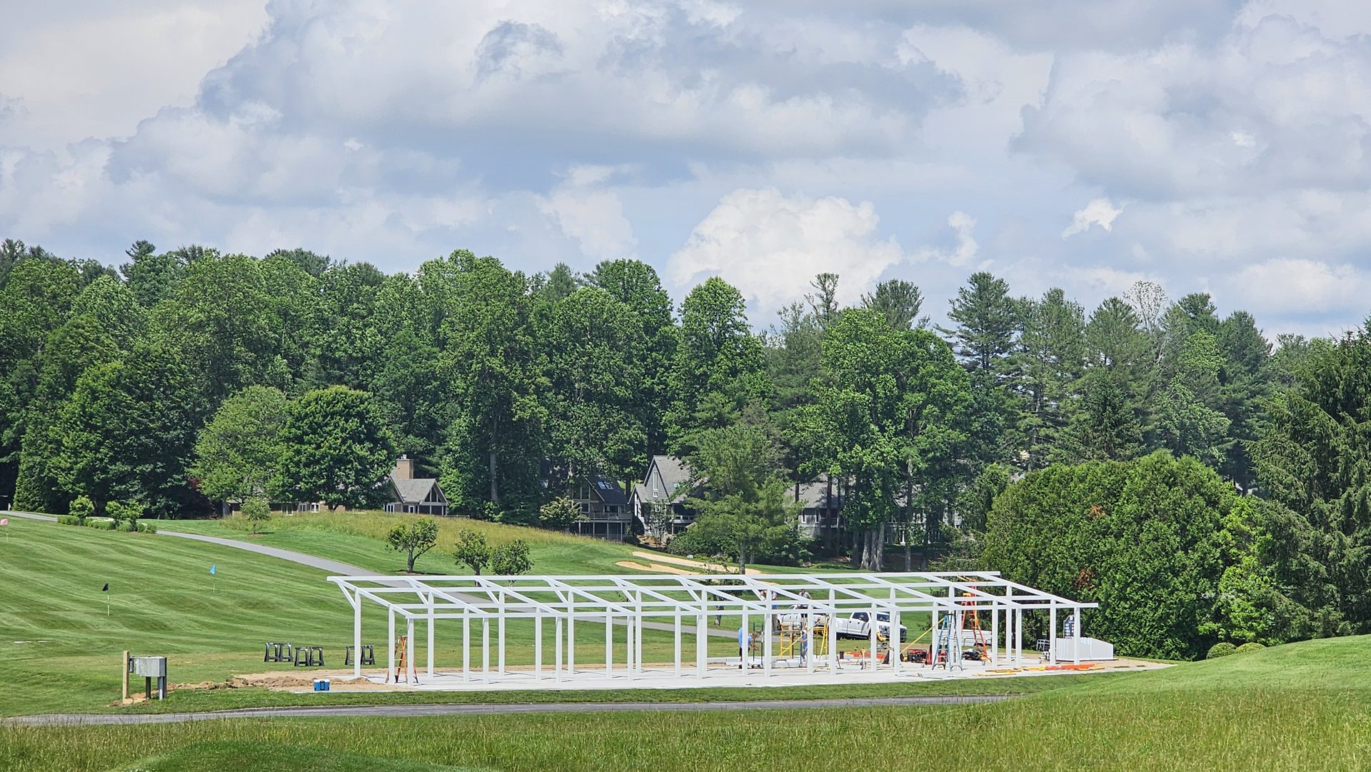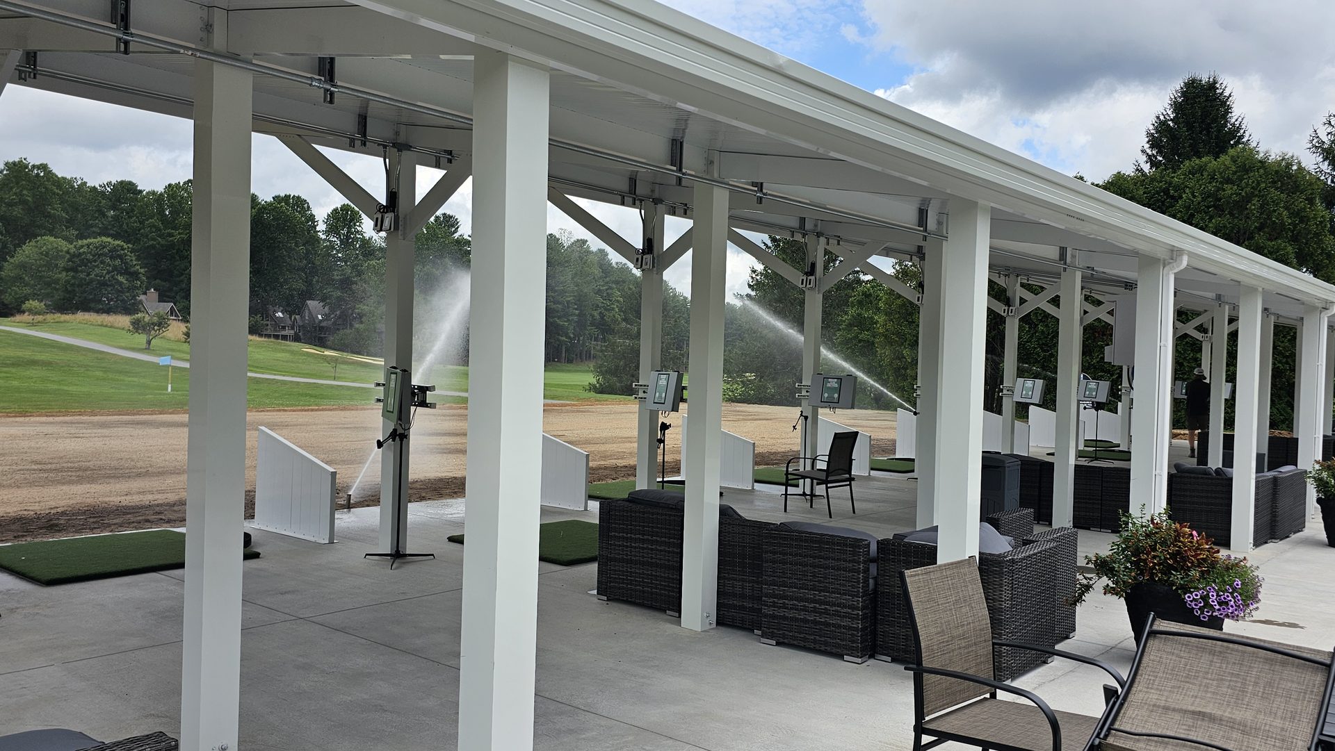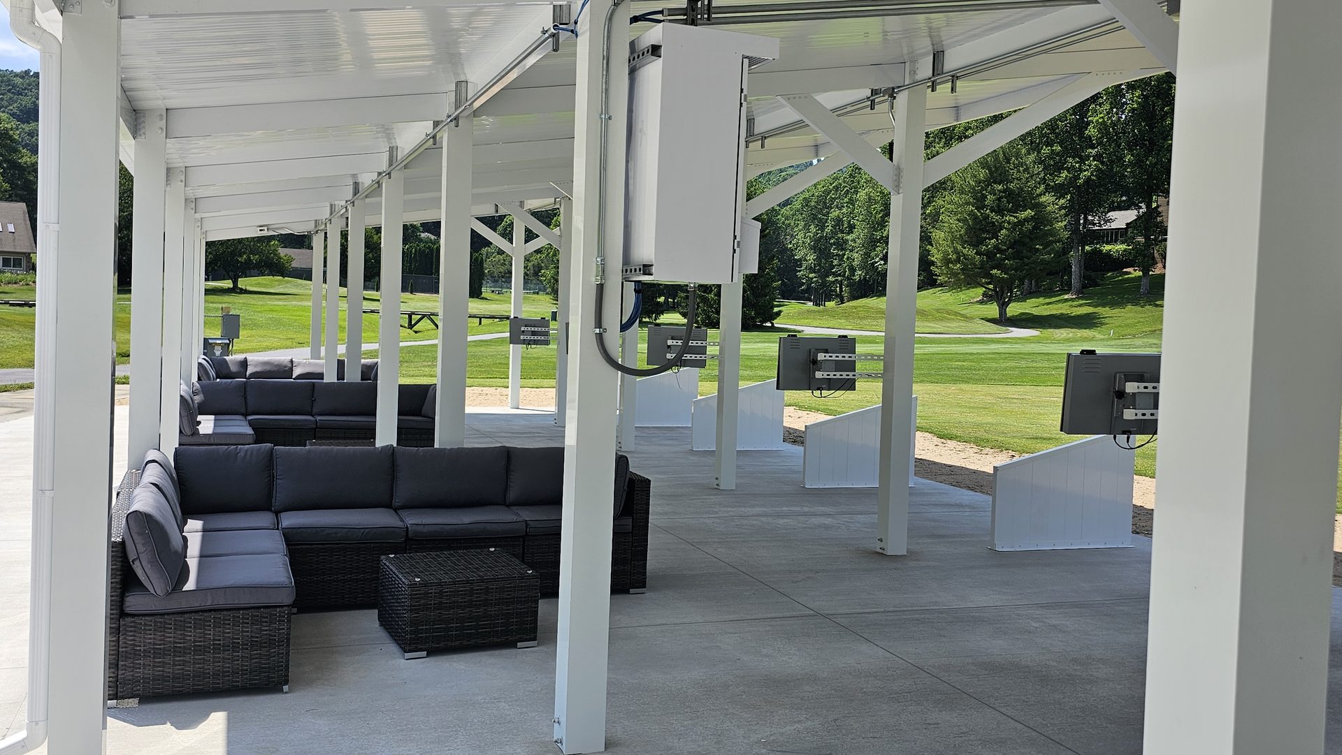 Early June marked the vertical transformation of the project. White steel framing rose over the new concrete pad, forming the canopy that would shelter golfers from sun and rain. Crews completed the structural assembly, wired electrical lines, and prepared for Toptracer technology installation.
