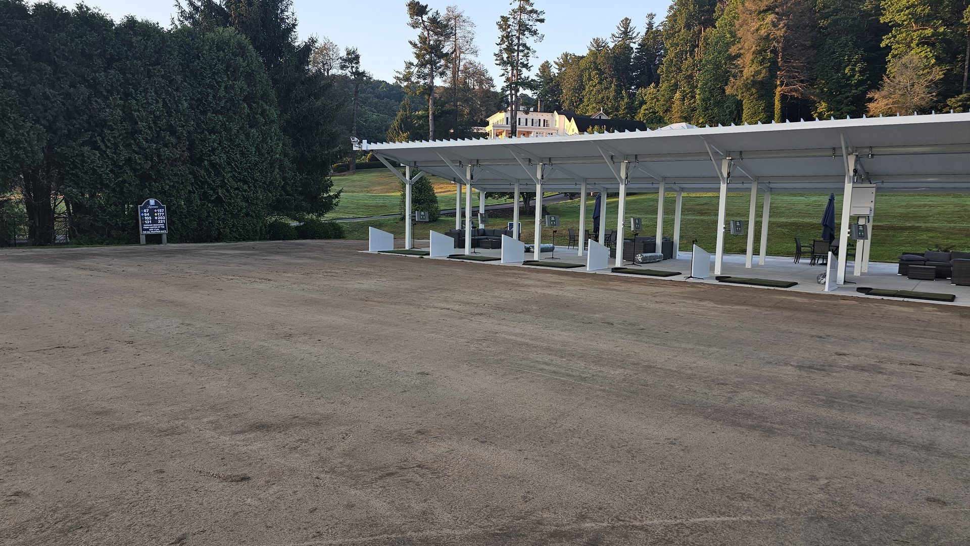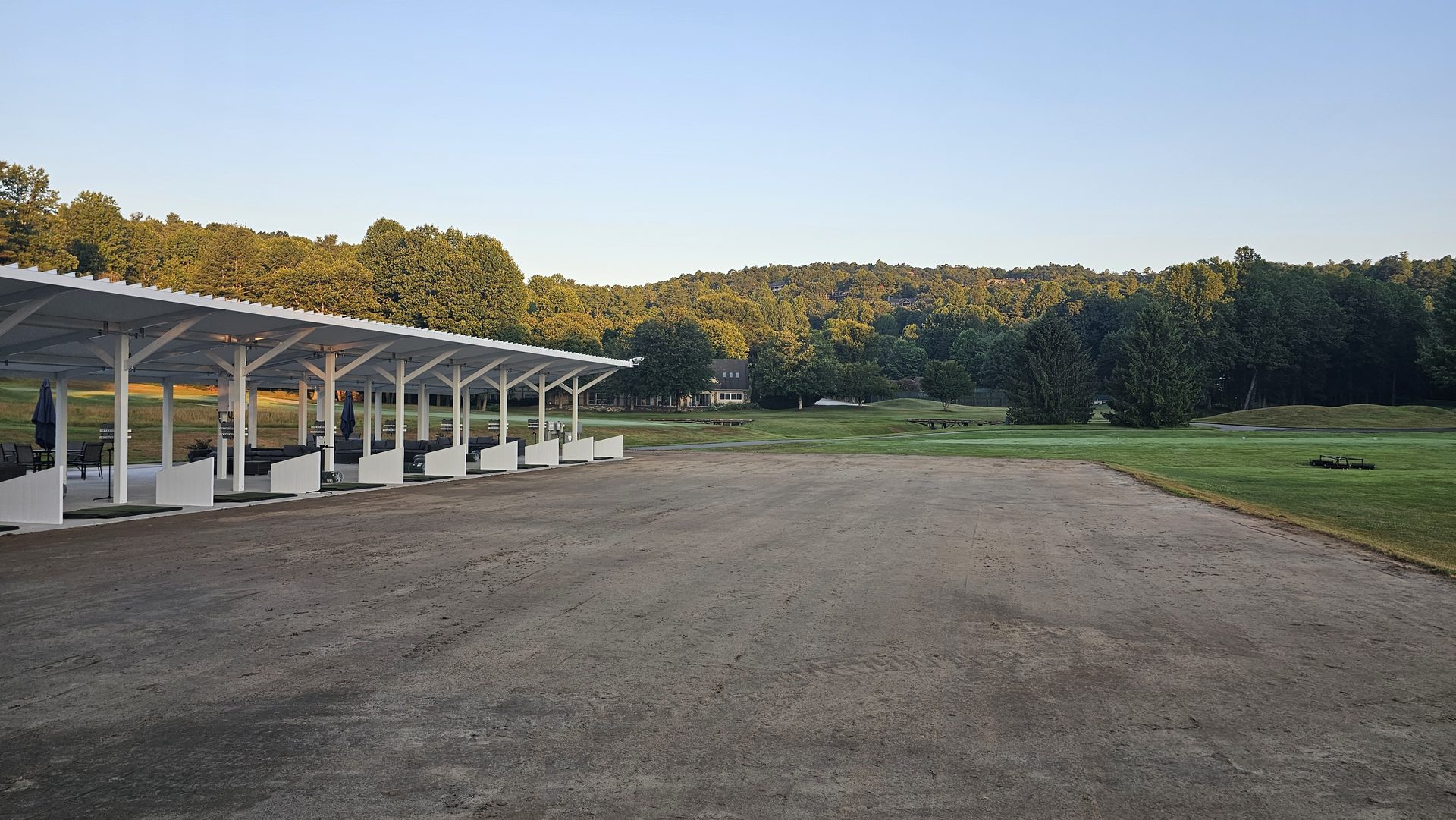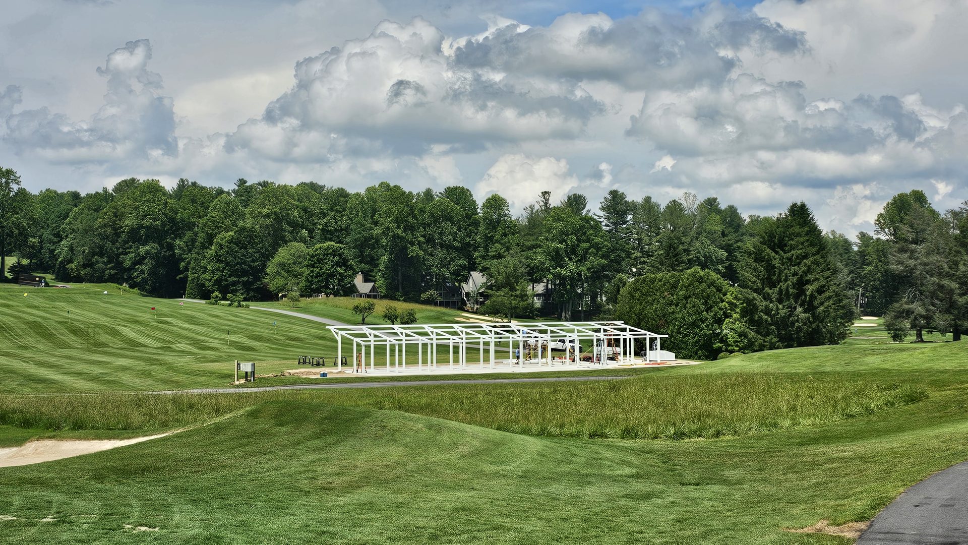 Early June marked the vertical transformation of the project. White steel framing rose over the new concrete pad, forming the canopy that would shelter golfers from sun and rain. Crews completed the structural assembly, wired electrical lines, and prepared for Toptracer technology installation.
