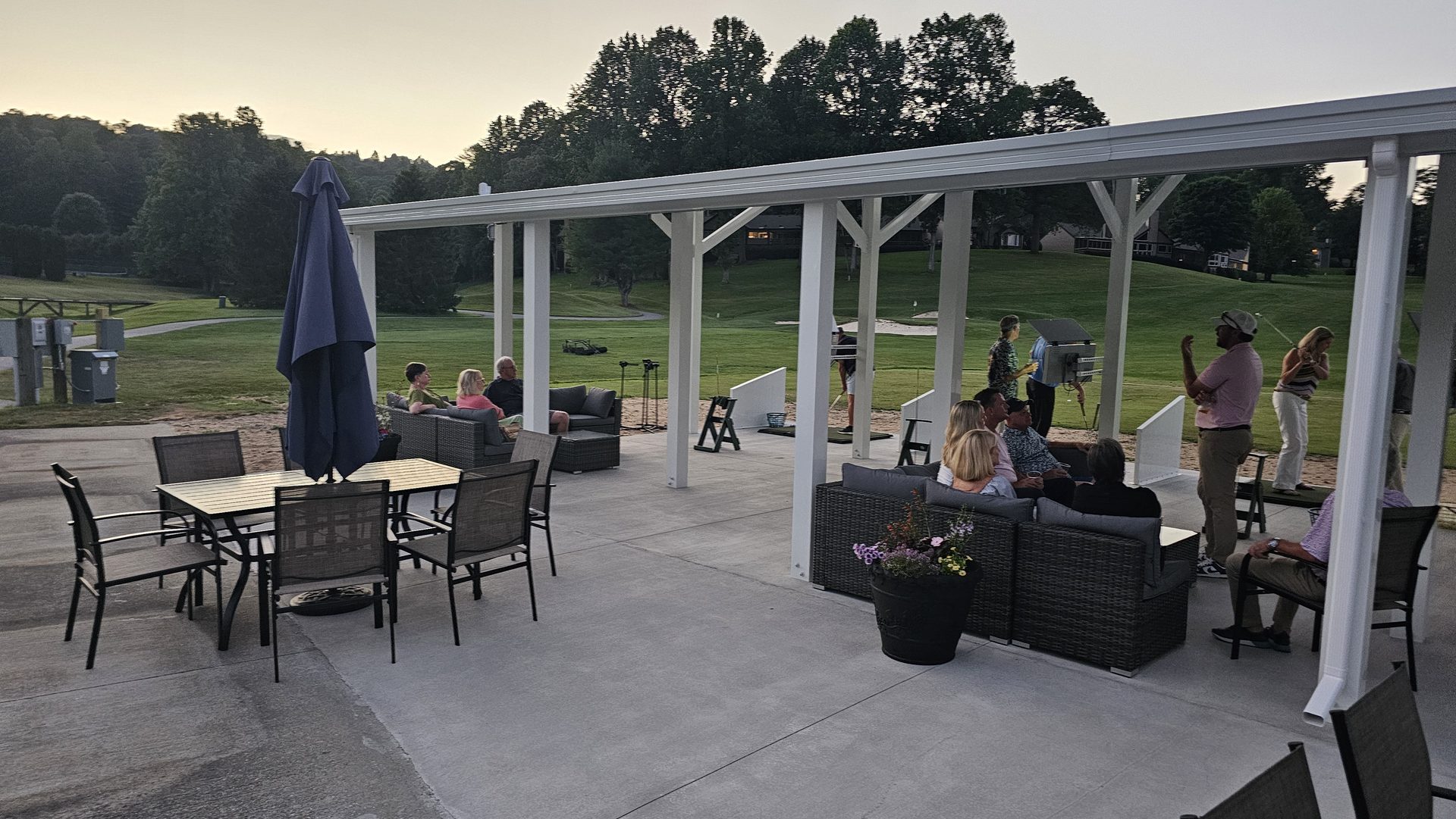 Evening sessions brought a new dimension to the experience. Photos from twilight show members gathered beneath soft canopy lighting, enjoying drinks and conversation around lounge seating and patio tables. The once-simple range had evolved into both a training ground and a community gathering space - golf performance paired with clubhouse atmosphere.