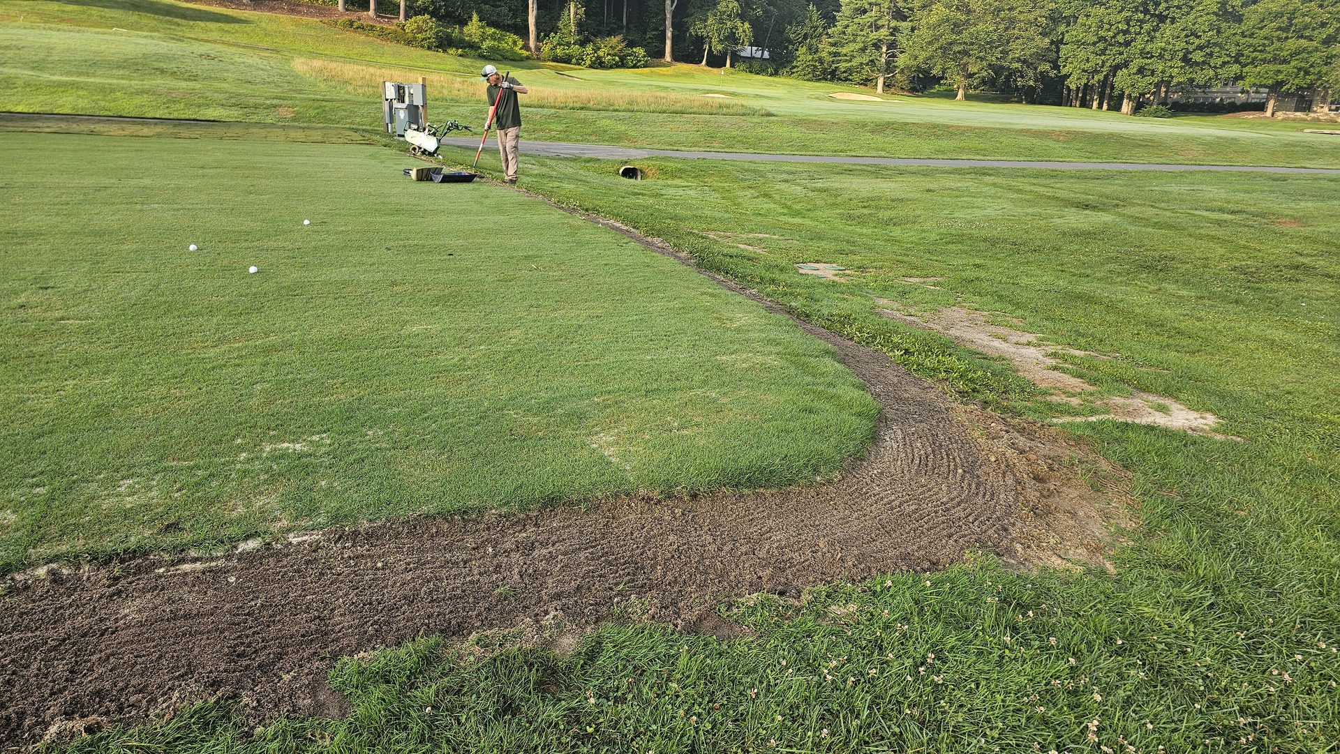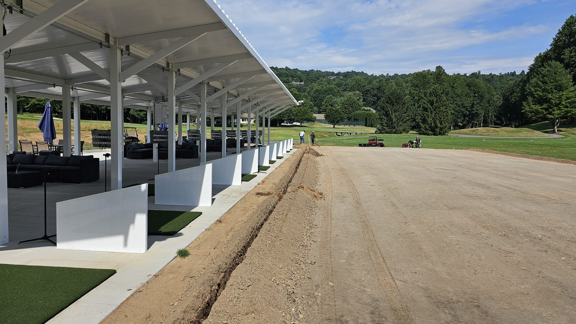 With irrigation operational, the final landscaping began. Fresh sod was installed along the front of the range and around the hitting bays, knitting the new construction into the natural contours of the property.
