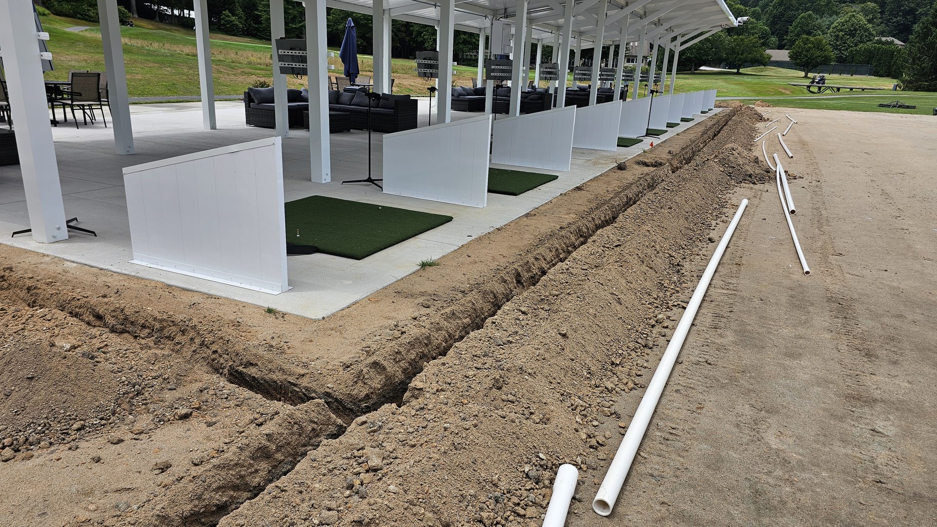 In early July, crews focused on refining the site and installing the new irrigation system that would support the freshly shaped turf areas. Trenches were excavated in front of the hitting bays for irrigation lines and control wiring, ensuring full coverage and optimal water management across the landing zone.