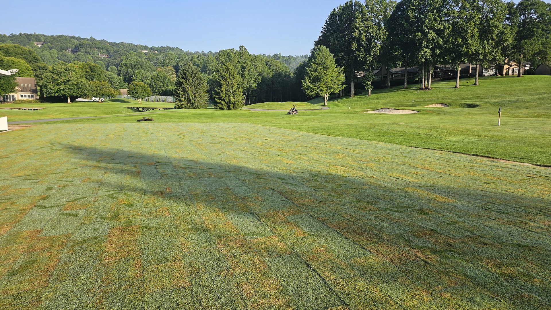 During the grow-in phase, maintenance crews mowed, topdressed, and rolled the turf in crisp grid patterns to promote density and smoothness. By mid-August, the turf displayed a deep green hue and healthy uniformity - a clear sign that the new range surface had fully established.